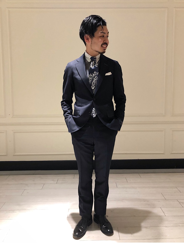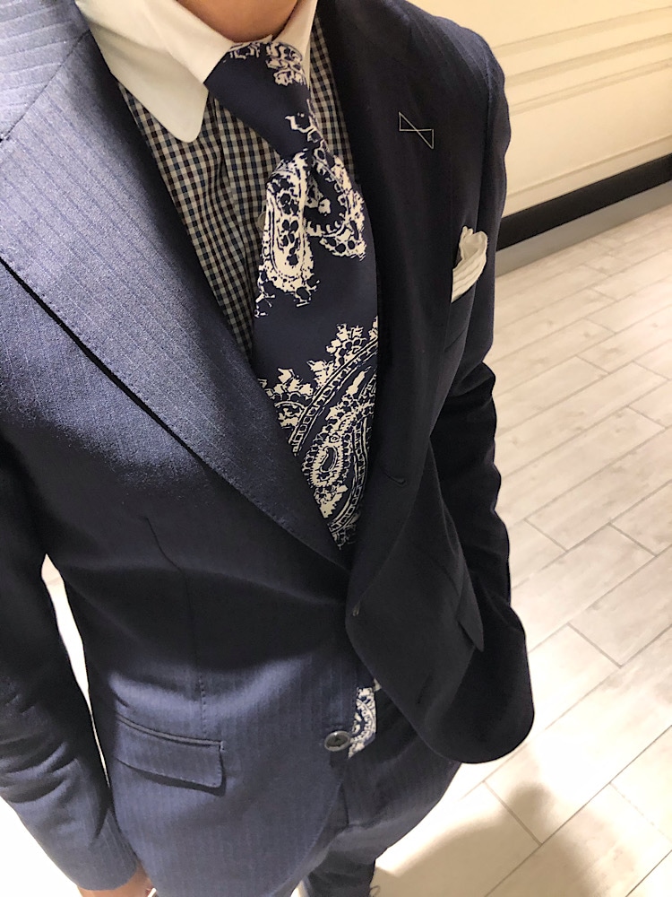 全体的にブルーでまとめ、清涼感を意識しました。ネクタイも大柄ですが使いやすいです。