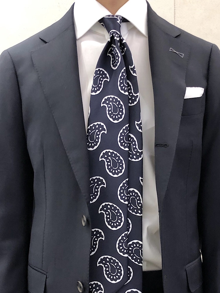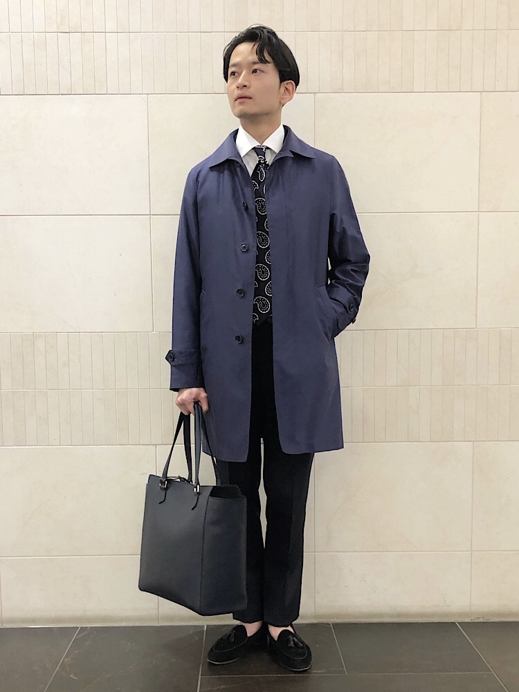 【着用レビュー 】シンプルなステンカラーコートを着用した春のビジネスコーディネートです。ネクタイにはトレンドの大柄のペイズリー柄を使用し、シンプルながらも新鮮さも感じられるスタイリングを意識しました。