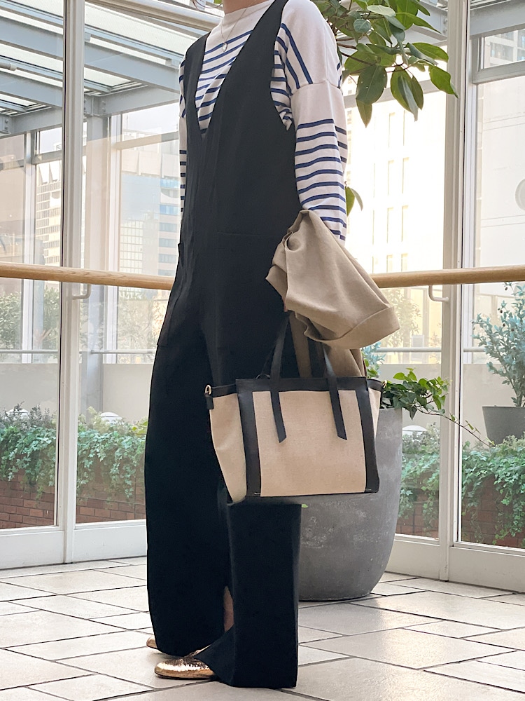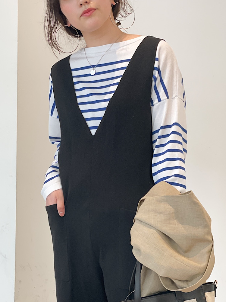 素材感・着心地:ミラノリブ素材で軽い着心地。綺麗めサロペットなので大人っぽく仕上がります。
