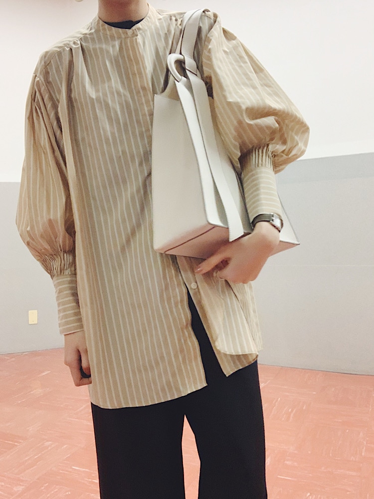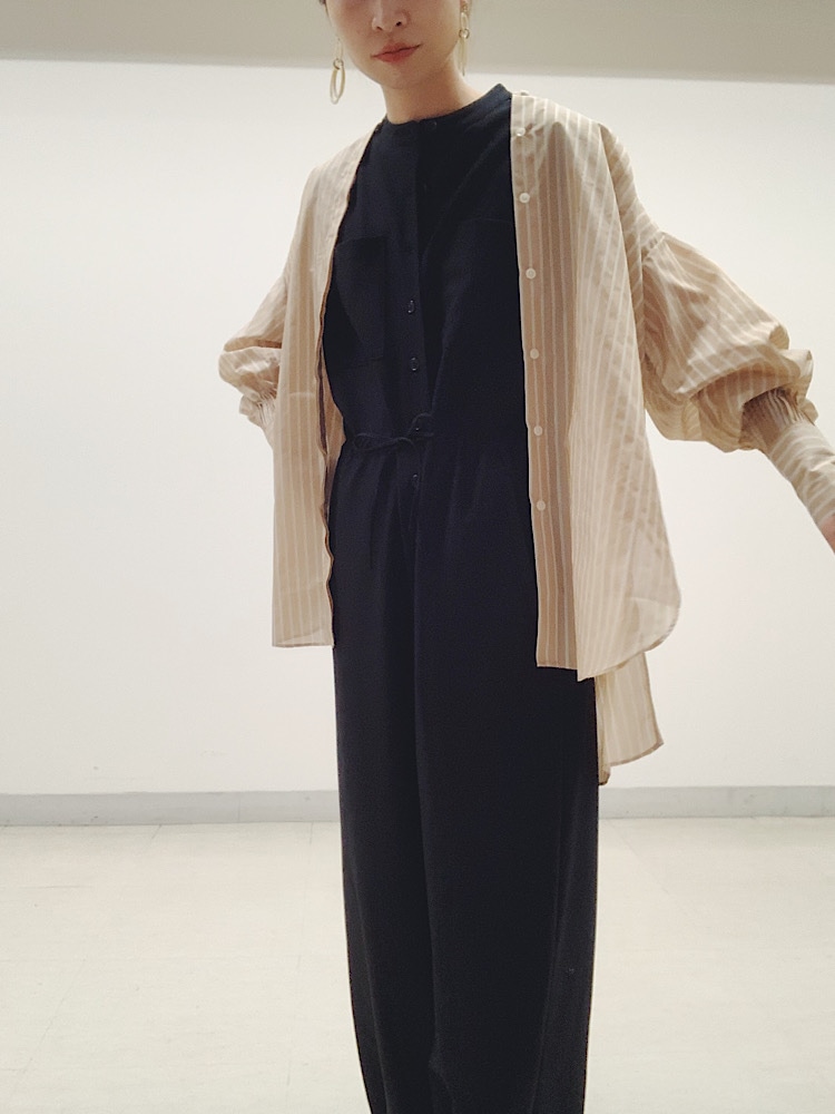 着用アイテム:オーバーオール 着用サイズ:ONESIZE サイズ感:ゆったり 素材感:ポリエステル素材でシワになりにくく、とろみのある素材で体のシルエットも出にくい。 着用アイテム:シャツ 着用サイズ:ONE SIZE サイズ感:ゆったり 素材感:ハリのある素材。袖のボリュームがポイント。