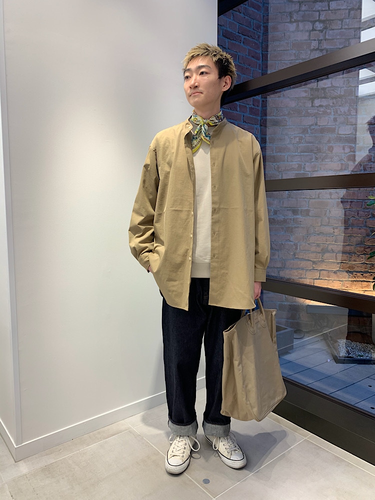 全体的にゆったり目で統一してシンプルかつ、トップスは同系色で今っぽさのあるコーディネートです。