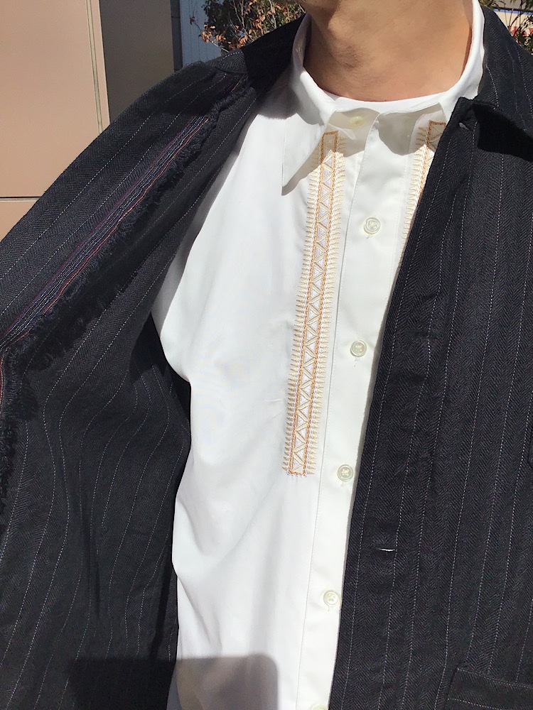 オーバーサイズのシャツを使用したレイヤードスタイルです。さりげない胸元の刺繍がポイントです。