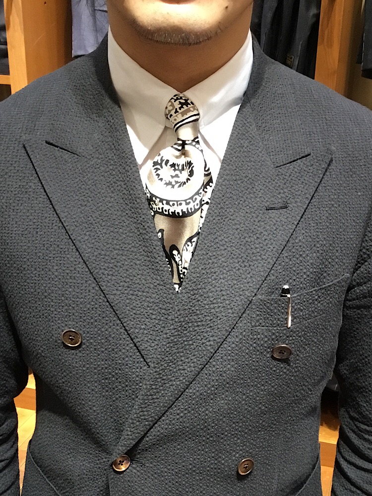 コーディネートポイント モノトーンに淡い色のプリント柄のネクタイを合わせてメリハリをつけました