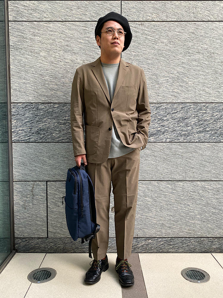 サイズ感:ジャケットはニットを着て身幅に握り拳が一つ分余裕があります。パンツはジャストです。