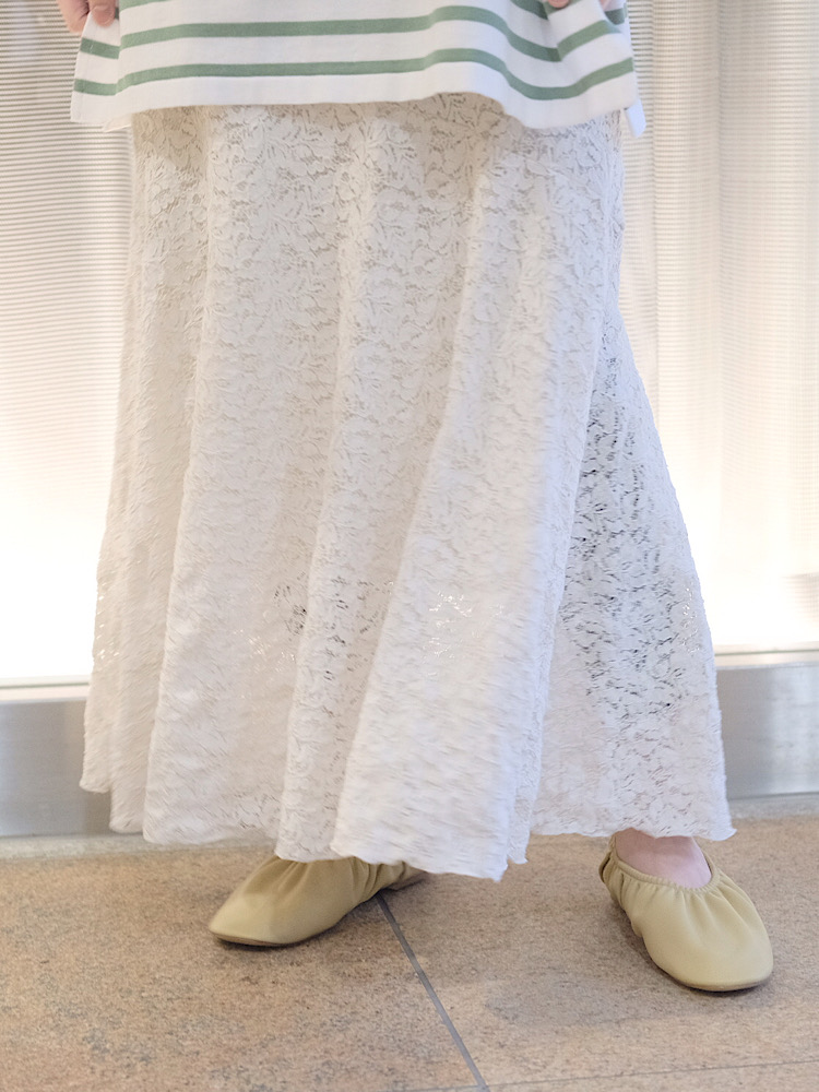 素材感・着心地:ジャージー素材のレースでカジュアルダウンしたスカート。