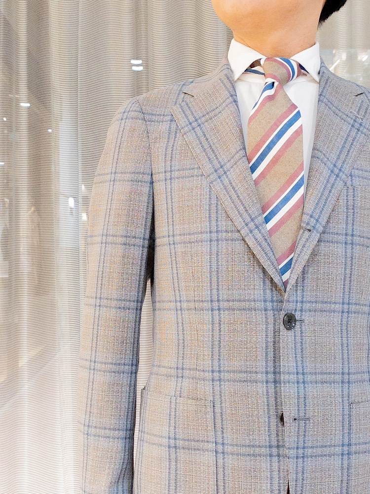 素材感・着心地:夏物のウール生地で、とても軽く清涼感も感じられる。店頭でお買い上げの場合は袖のボタン付けなどの修理を承ります。