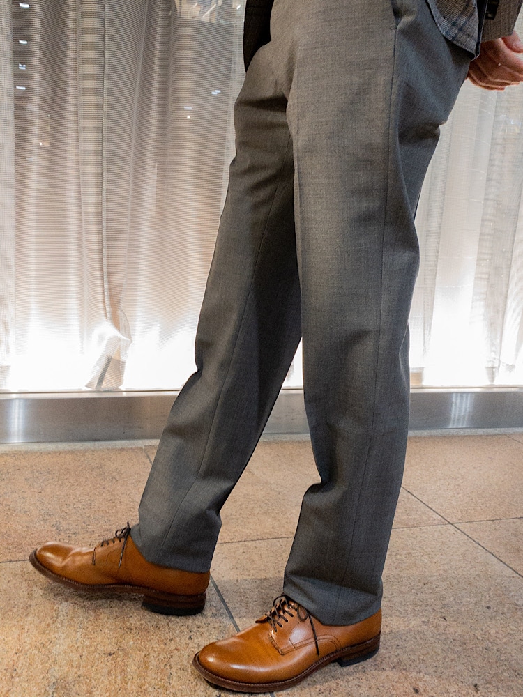 素材感・着心地:ポリエステルとウールの混紡素材。ご自宅での洗濯も可能。こちらのパンツも店頭にて裾上げ修理を承ります。