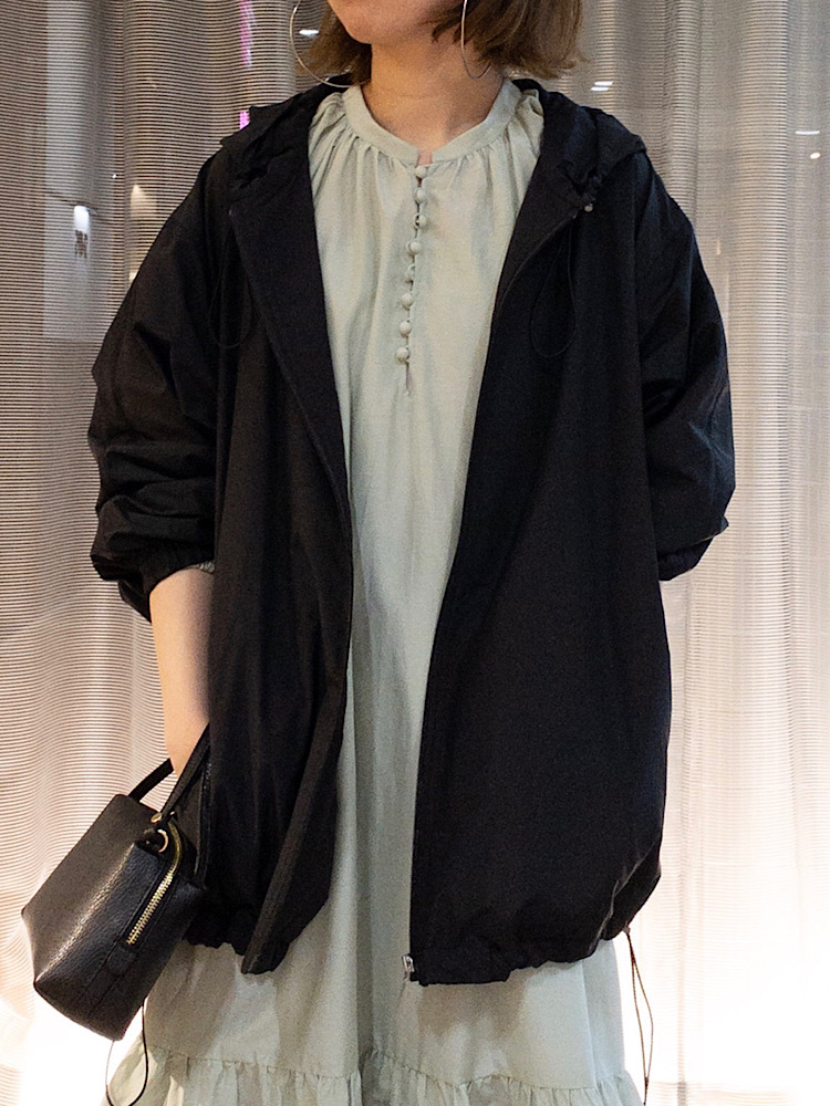 素材感・着心地:薄手。裏地なし。裾はドローストリングなのでクシュっと絞ると可愛いシルエットです。