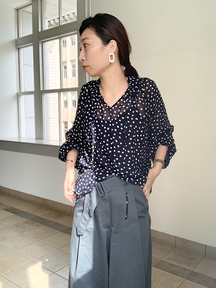 【着用レビュー】 身長:173cm / 普段サイズ:M 着用アイテム:ブラウス 着用サイズ:ONE SIZE サイズ感:ゆったり 素材感・着心地:ポリエステルでシワになりにくい。肌にまとわりつかない、とろみのある生地感。