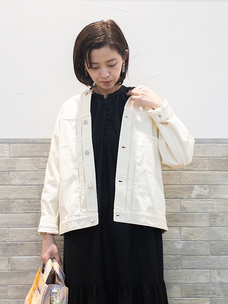 素材感・着心地:固めデニム素材。袖まわり大きめで羽織りやすい。
