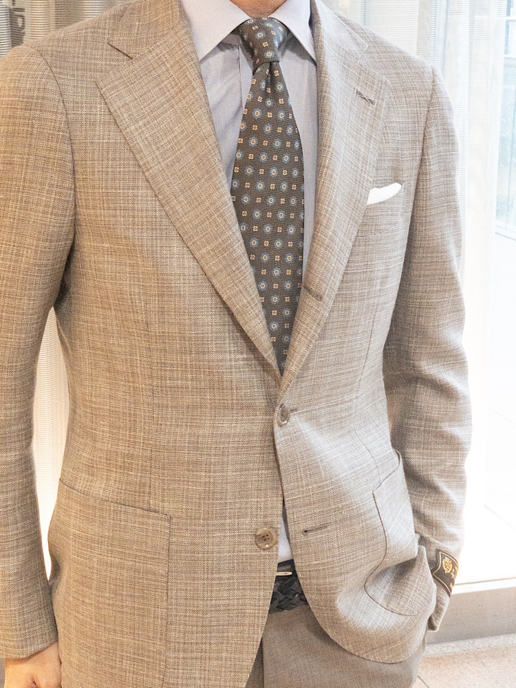 素材感・着心地:夏物のウールとシルクリネン地。上質なドレスジャケットながら、ややざっくりとした編み地で通気性も良い。店頭でお買い上げの場合は袖のボタン付けなどの修理を承ります。