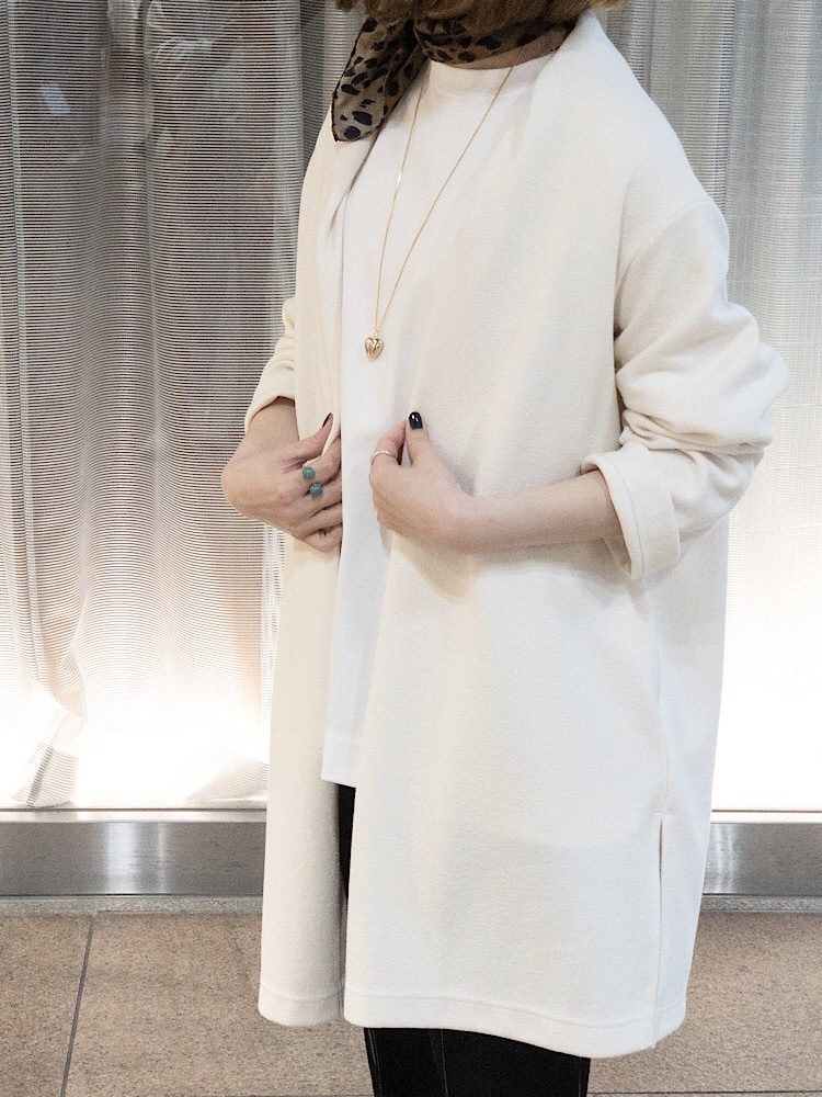 素材感・着心地:裏地なし。ガウンスタイルでサクッと羽織れます。程よい生地厚で春先から着られる生地感です。