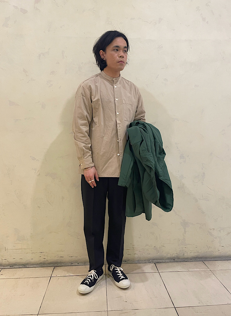 【着用レビュー 】 着用アイテム:アウター 身長:169cm / 普段サイズ:L/ 着用サイズ:L サイズ感:ゆったり 素材感:ナイロン 着心地:ゆったりしているため軽く楽に羽織れる。パッカブルなので持ち運びもできる。 着用アイテム:パンツ 身長:169cm / 普段サイズ:L/ 着用サイズ:L サイズ感:テーパードシルエット 素材感:ウール 着心地:シルエットが綺麗で動きやすい 着用アイテム:シャツ 身長:169cm / 普段サイズ:L/ 着用サイズ:L サイズ感:ややゆとりがある 素材感:コットン100 ハリコシがしっかりしている 着心地:ハリコシがしっかりしているため着用してもストレスなく着れる