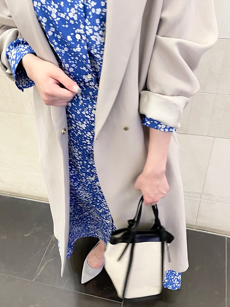 華やかな総柄のワンピースに定番のチェスターコートを合わせました。
