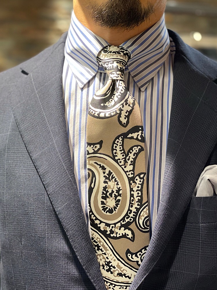 素材感:イタリアの生地を使用したシップスのオリジナルのネクタイです。イタリアンファブリックらしい大胆な柄とソフトでしなやかな質感が特徴です。こちらは柔らかいベージュですので、グレー系、ネイビー系のスーツどちらとも相性が良いです。遊びのあるコーディネートでしたら、ブラウン系のジャケットに合わせていただくのもお勧めです。こちらのネクタイは5色展開しておりますので、他のお色も是非ご覧くださいませ。