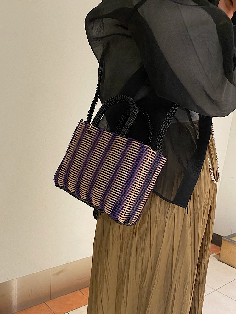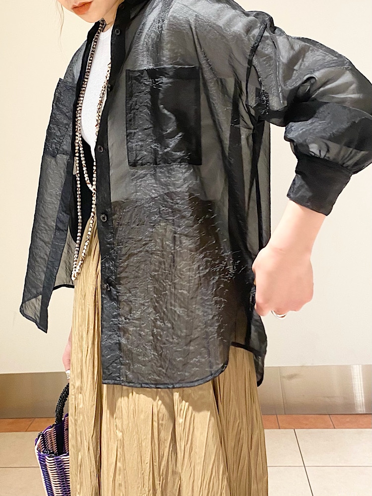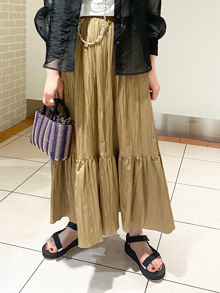 素材感:ポリ100%で自宅洗い可。微光沢感あるため、ティアードスカートでもカジュアルになりすぎない。