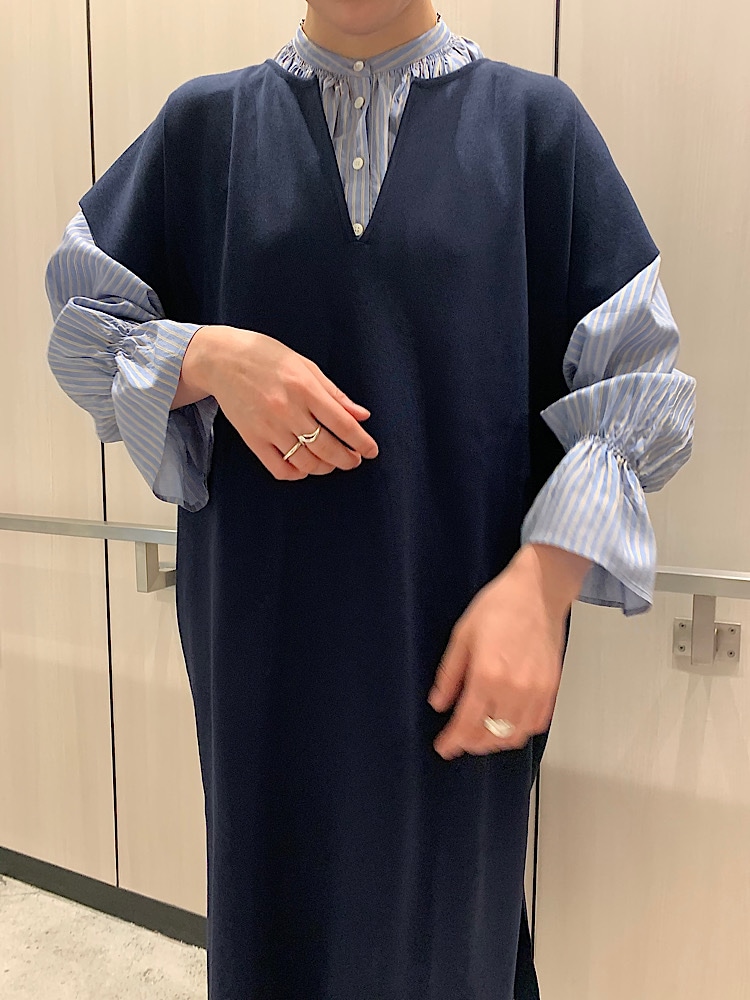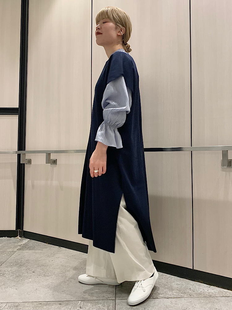 素材感・着心地: 落ち感のある素材なので、中にレイヤードしたときに着膨れしにくく、程よく体型をカバーしてくれます。サイドにスリットが入っているので、下からボトムがちらっと見えるのがポイントです!