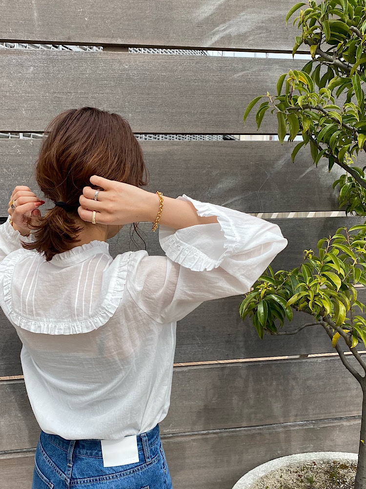 ブラウスのデザインを活かすため、あえてボトムはシンプルなデニムを合わせました。バッグに柄を取り入れ、アクセントをつけました。