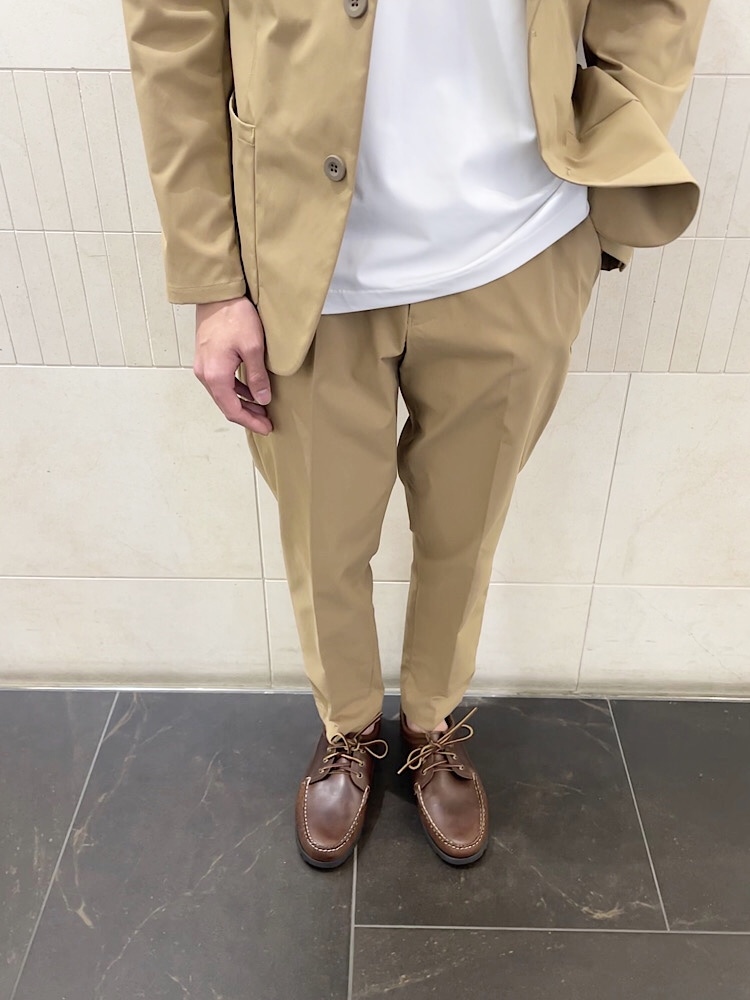 TAIONの3点セットアップにQuoddyのモカシンシューズを合わせドレスカジュアルな印象に仕上げました。