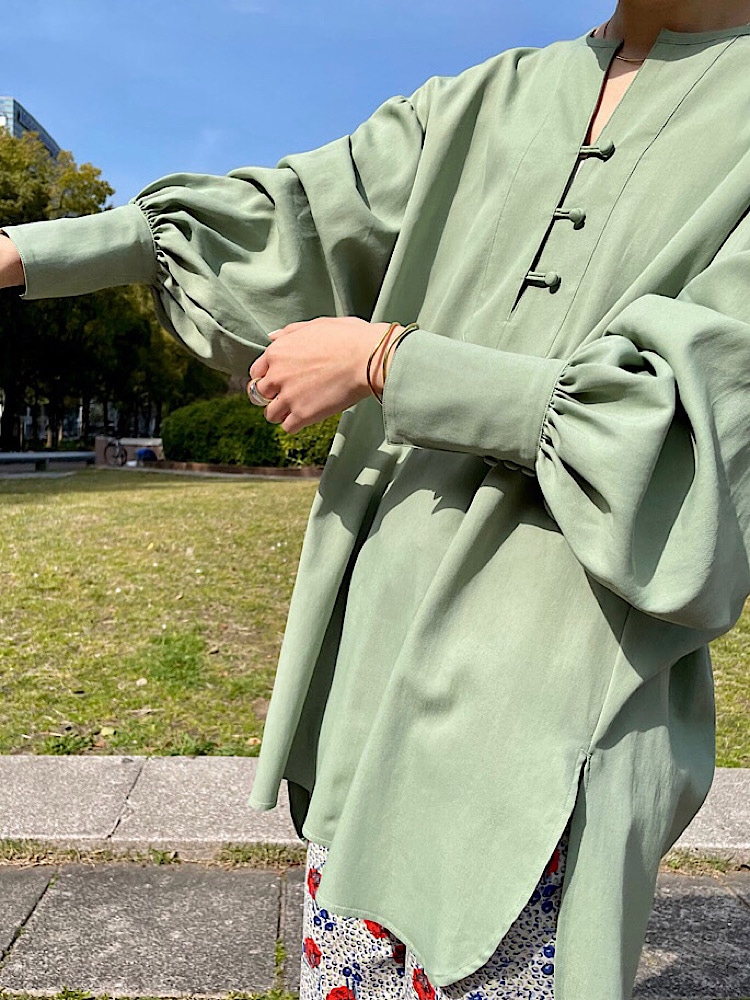 サイズ感:ボリュームのある袖と、膝裏まである丈感でかなりゆったり目のシルエット。