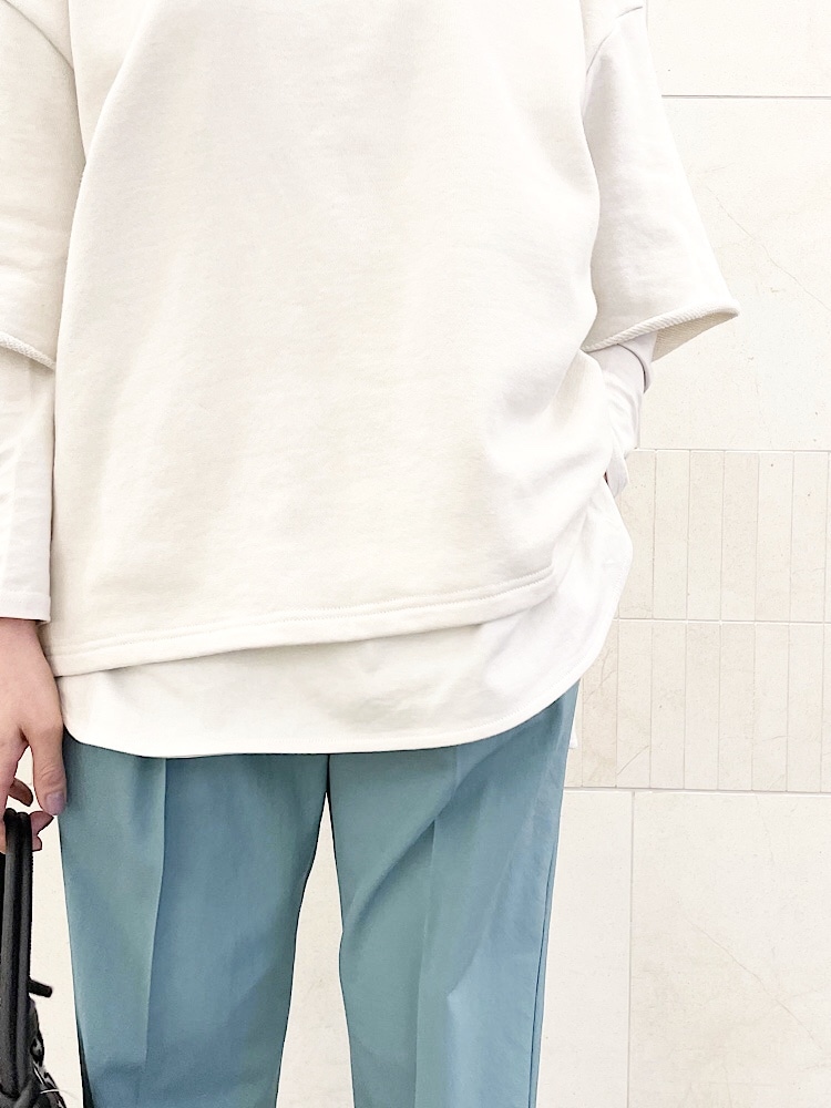 オーバーサイズの裏毛トップスはレイヤードで使えるカットソー付きなので即コーデが完成するアイテム。ナチュラルなカラーに差し色でグリーンのパンツを合わせて、辛めの小物で引き締めました。