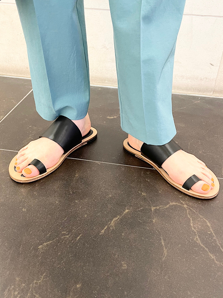 着心地:サラッとしたポリ素材で着心地良いです。裾にスリット入りで、綺麗めにもカジュアルにも着回しやすいパンツです。
