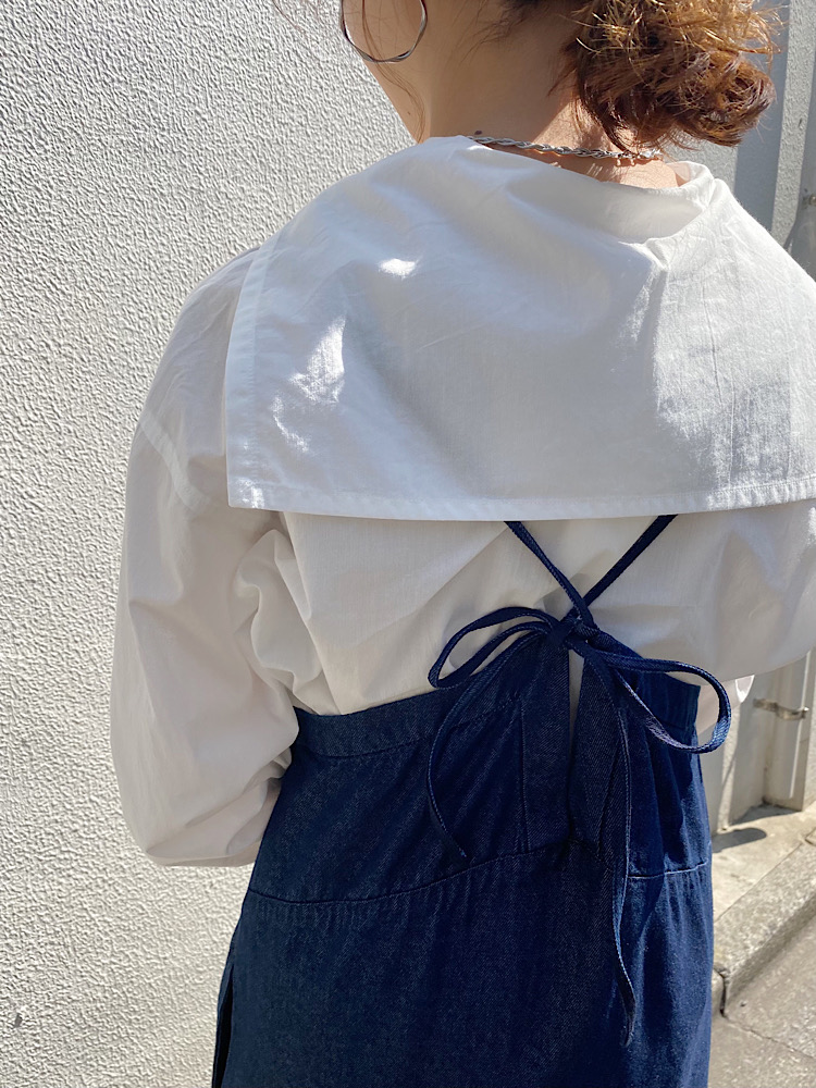 トレンドのセーラーシャツを合わせ、小物のカラーでアクセントをつけました。