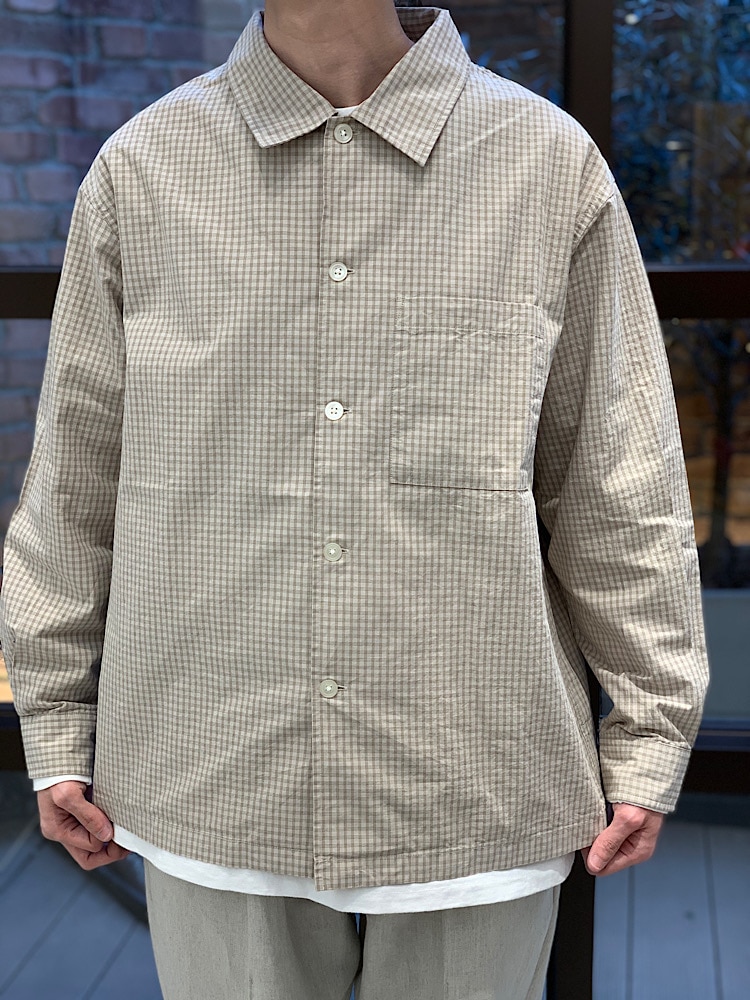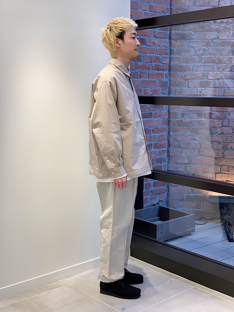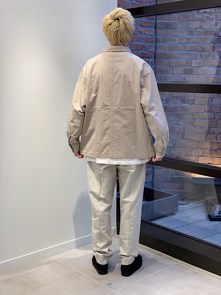 全体的にゆったりとしたスタイリングを同系色でまとめて、足元にワンポイントで黒を入れました。