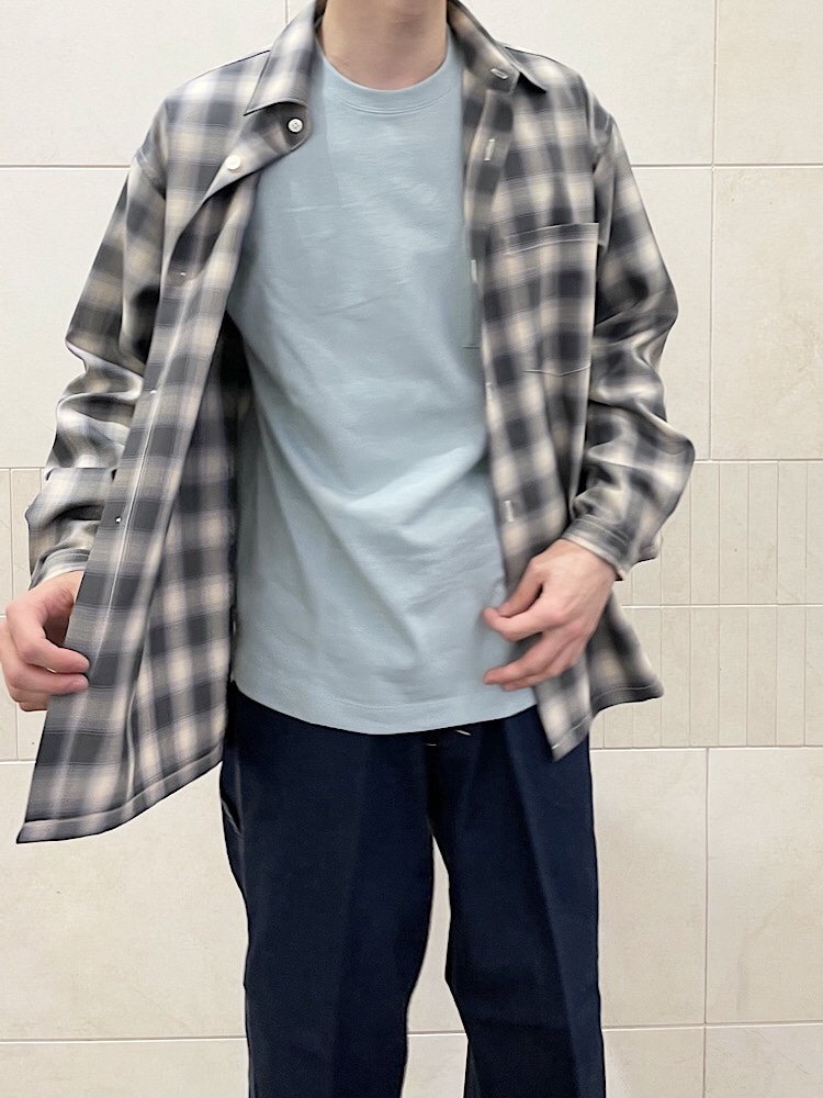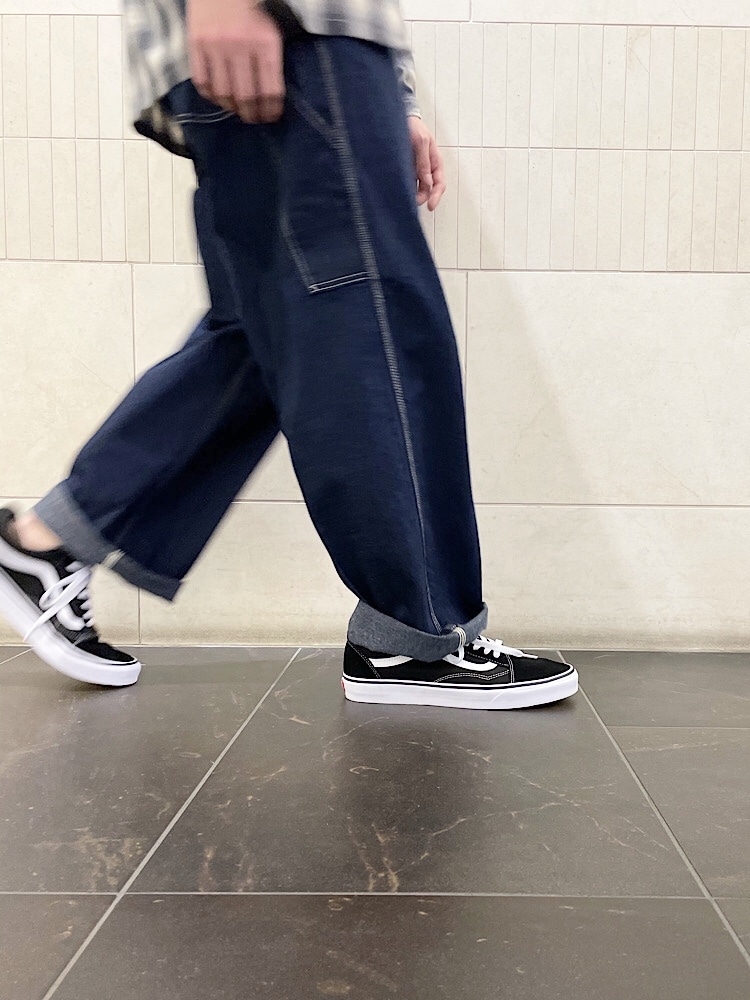ウールのチェックシャツにLeeのワイドパンツ、VANZを合わせ、ストリートライクなコーディネートに仕上げました。