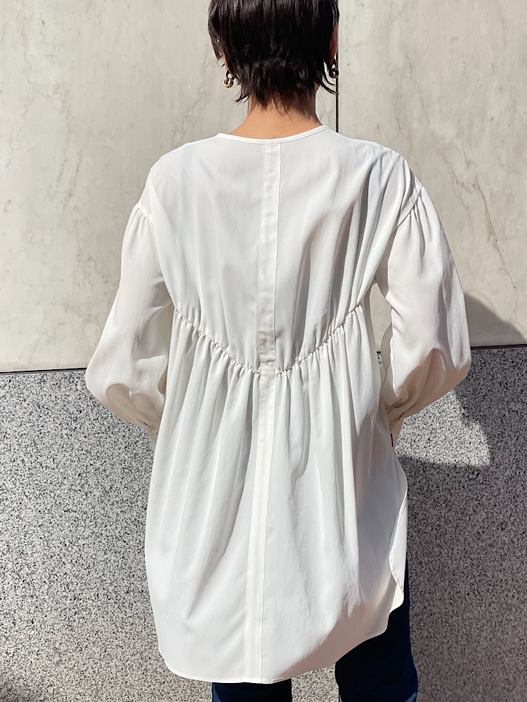 着心地:後ろ身頃はお尻がすっぽり隠れる長さで腰回りが気にならないです。また背中に入っでいるVのギャザーがバックスタイルを綺麗に見せてくれます。