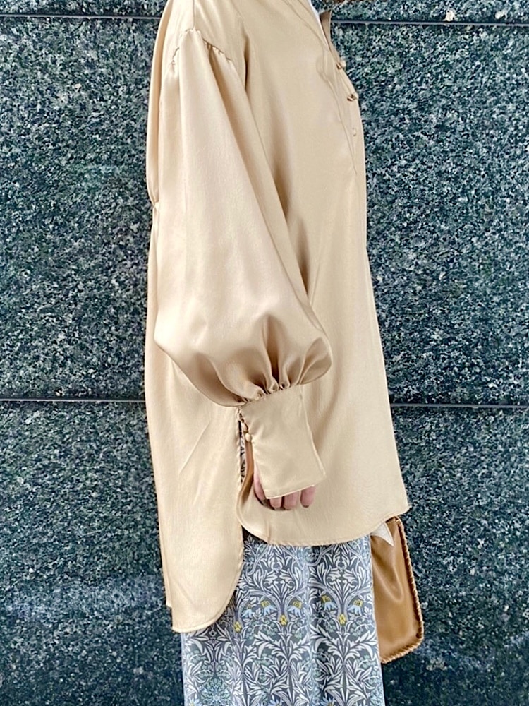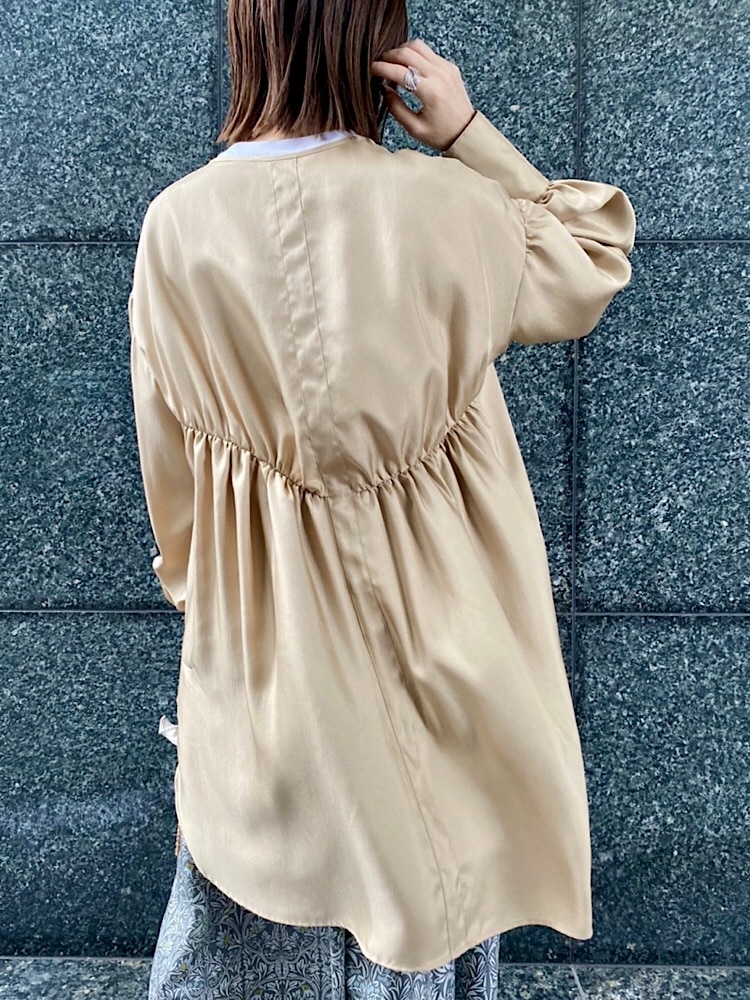 サイズ感:オーバーサイズ。着丈長めでお尻もすっぽり隠れ体型カバーもしてくれます。背中のギャザーにより、後ろ姿まで抜かりなく細見えです。