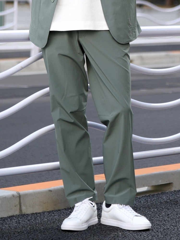 素材感:ほのかに光沢感のあるキレイ目な伸縮性のある生地で、洗濯しても形が安定する防シワ加工を施している。