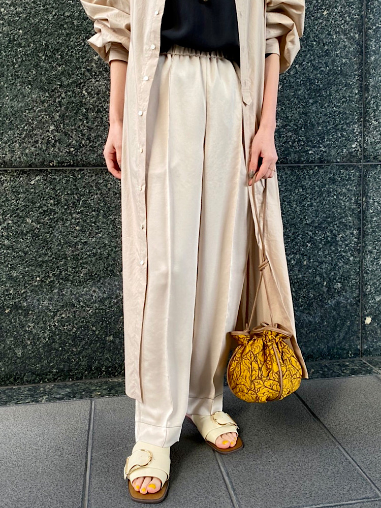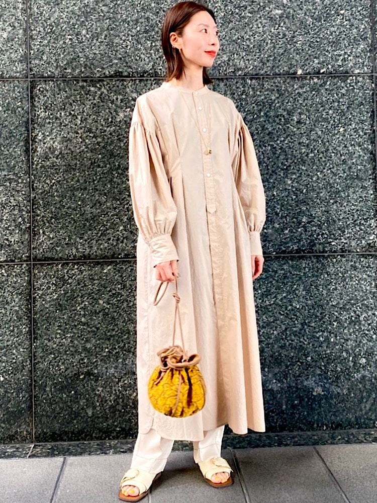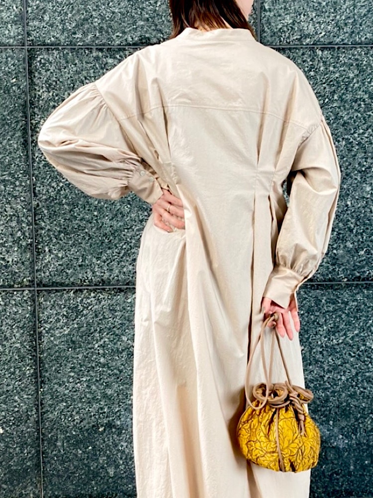 タックが素敵なワンピースを艶感ある素材と合わせて大人カジュアルに。