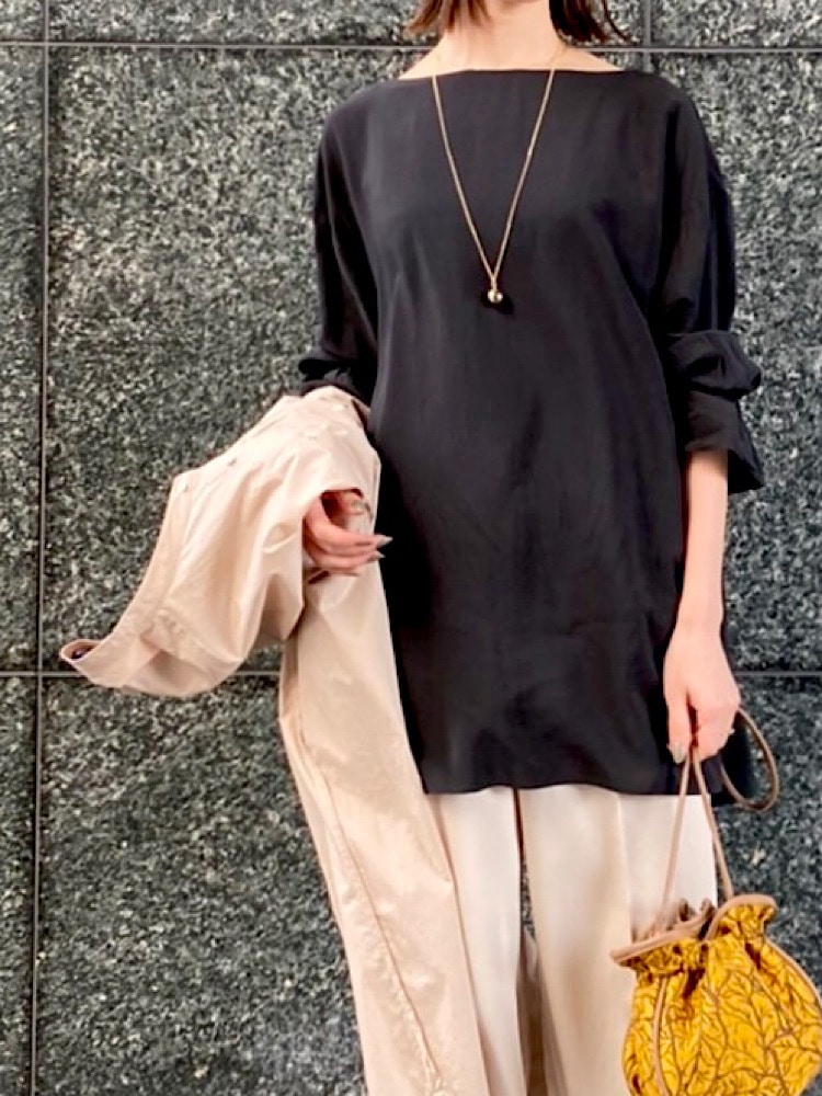 サイズ感:程よいゆとりがありますが、タックのお陰で着るだけでスタイル良く見えます。着丈も長過ぎずレイヤードを楽しめます。