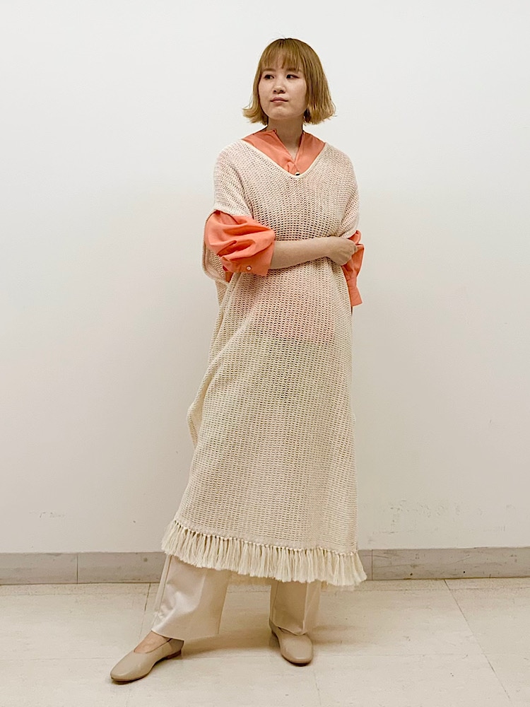 素材感:そこまで温かみを感じる事なく、爽やかに着られる。チクチクもせず、ノースリーブと合わせても良い。