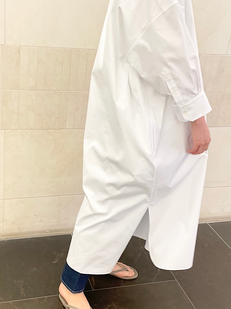 クリーンな白のシャツワンピを主役に、デニム合わせでカジュアルな印象にまとめました。長さがあるワンピースなので小物は軽さを感じる夏らしいアイテムで。