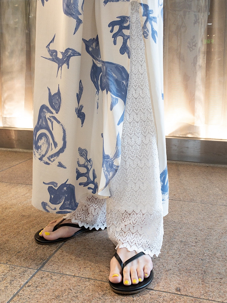 伸縮性のあるレースを使用。セミフレアデザインで美脚効果も。