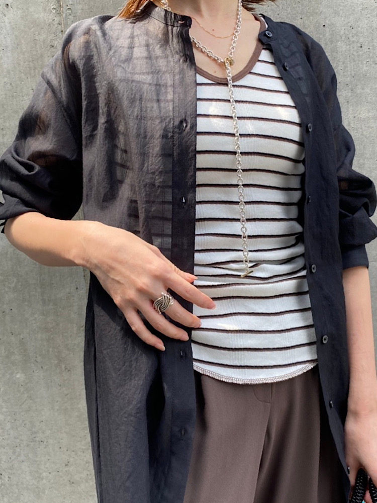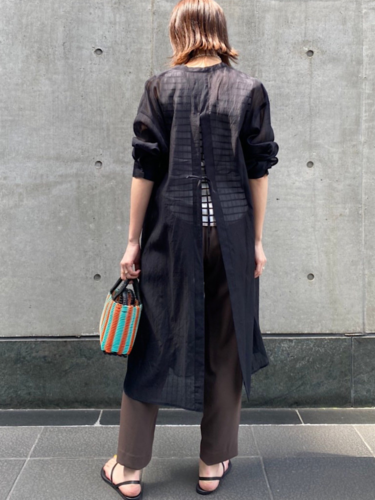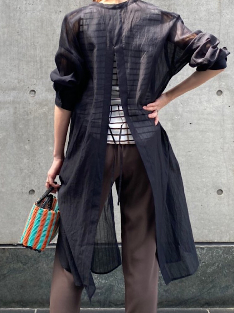 透け感あるシャツワンピースはあえての黒で大人っぽく。