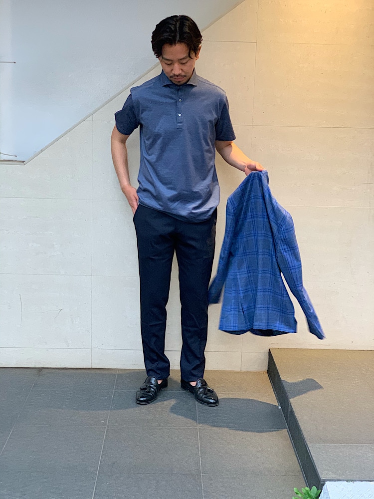 ポロシャツのスカイブルーが軽快さと上品な印象をもたらしています。