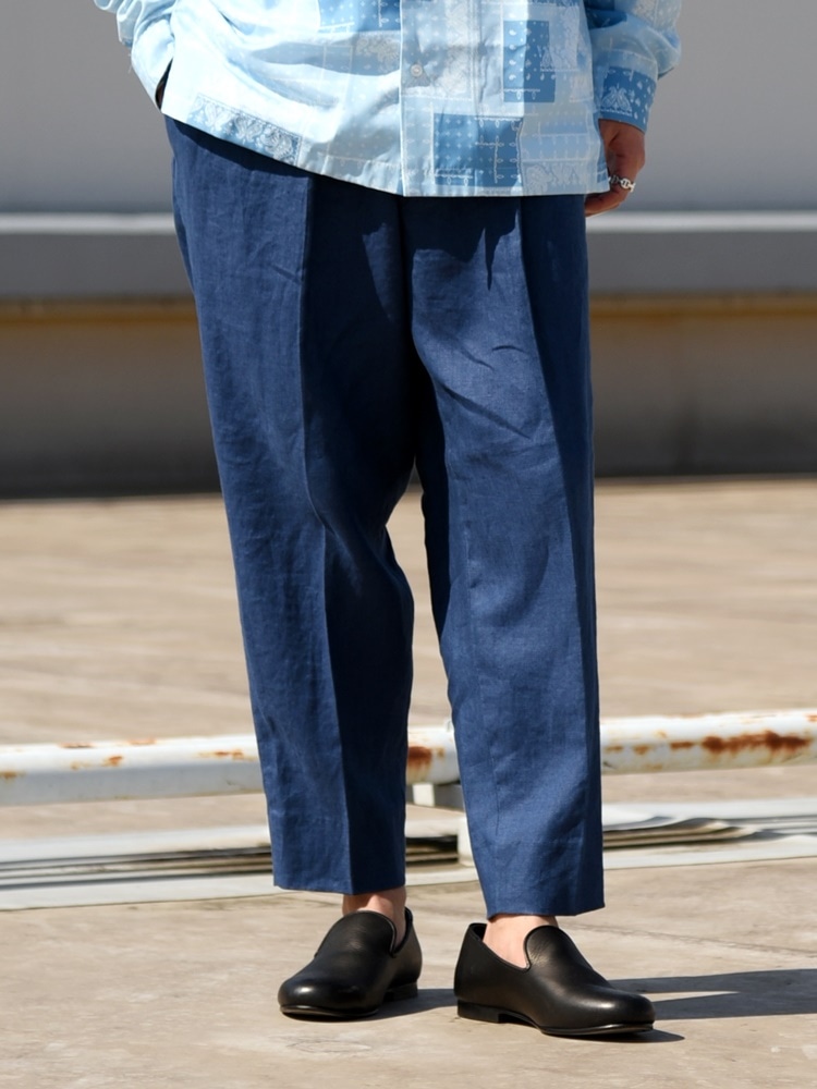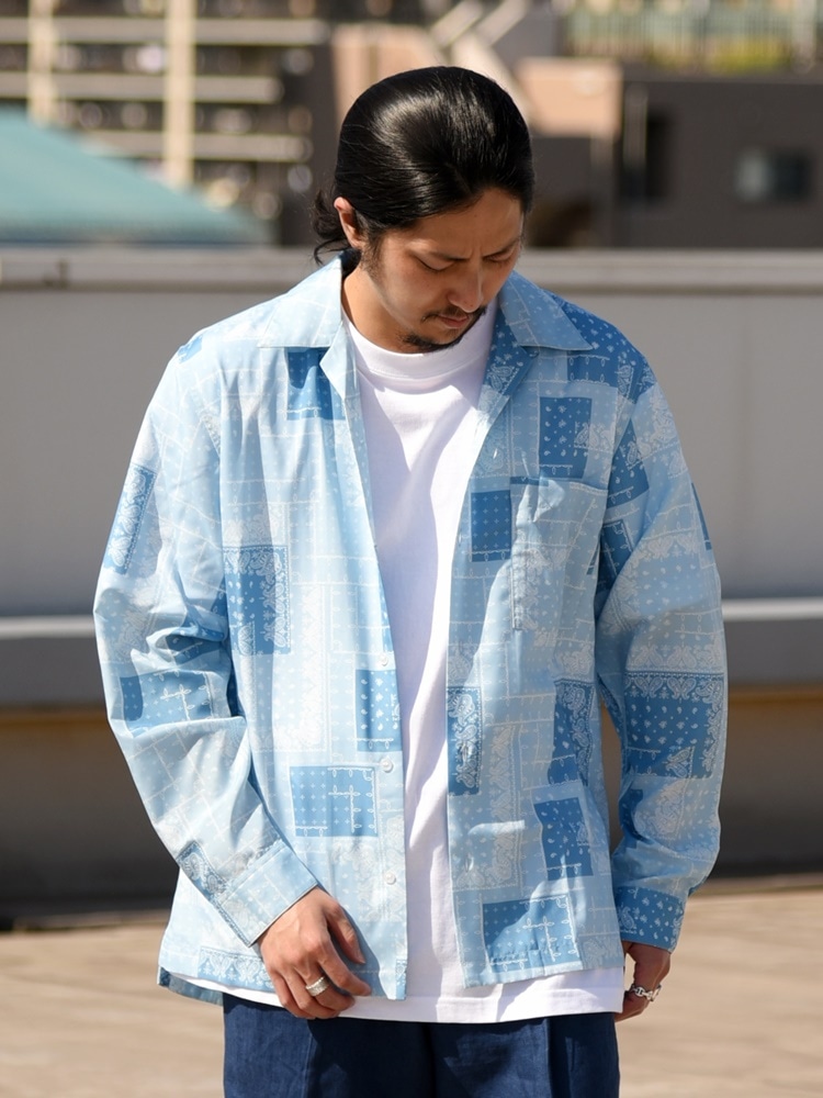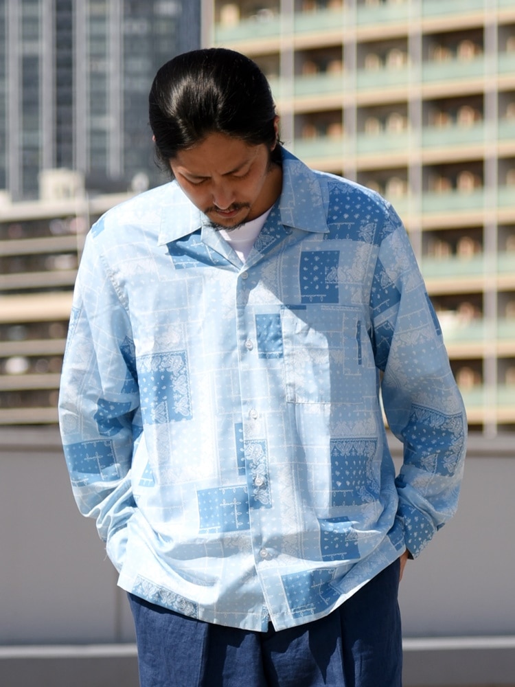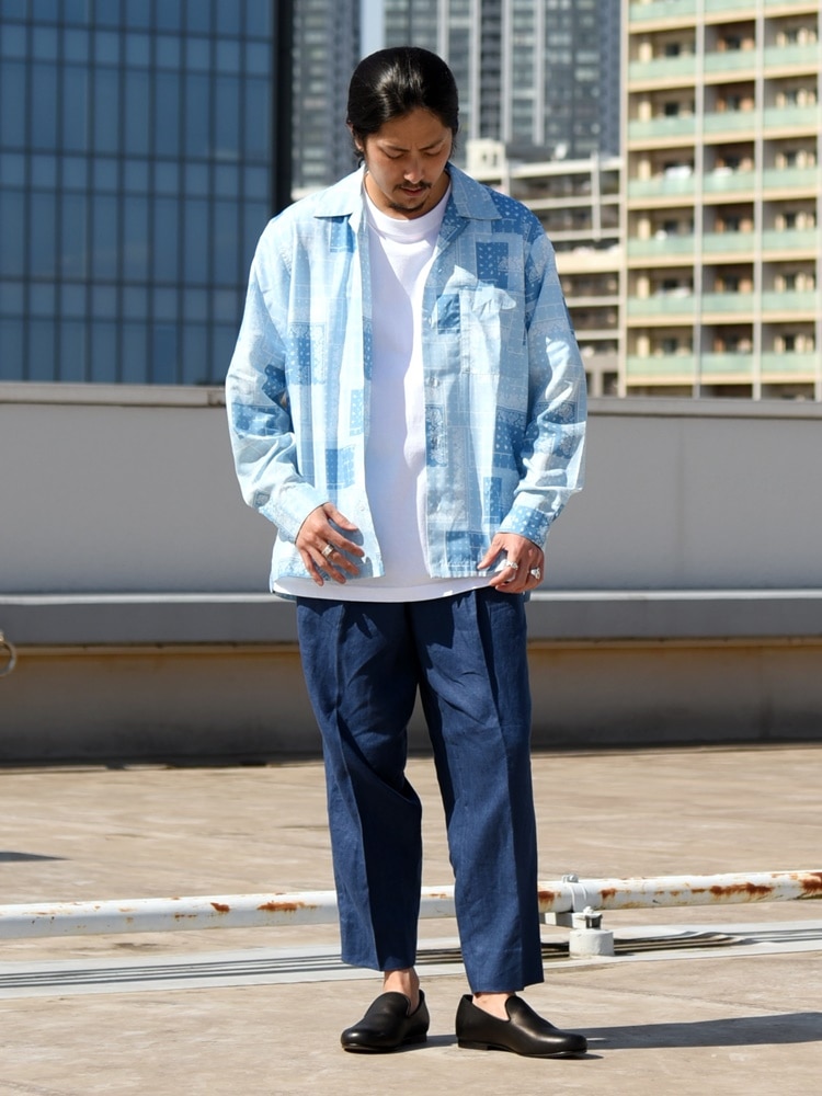 バンダナ柄のオープンカラーシャツとリネンパンツを合わせたブルーコーデ