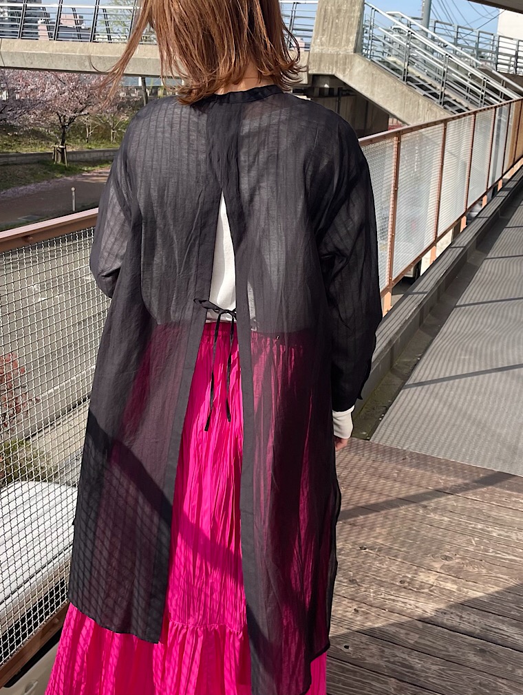 素材感:シルク混なのでやや光沢感があり綺麗。サラッとした肌触りなので夏場の羽織ものにもピッタリ。