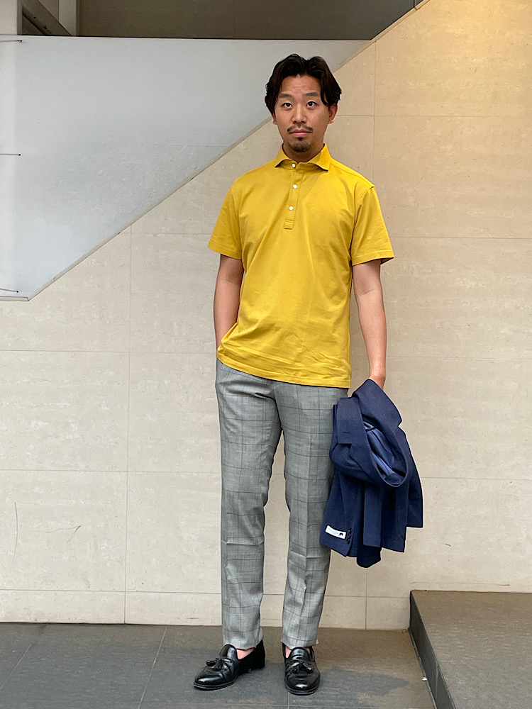 ネイビー×グレーのベーシックなジャケット&パンツスタイルにイエローの色を差し込み新鮮なコーディネイトへ。