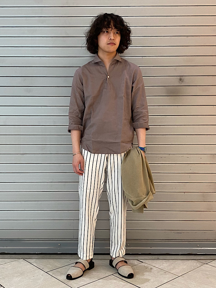 【素材感・着心地】リネンのカラッとした、夏場も気持ちよくご着用頂ける素材感。防シワ加工が施されており、痒い所に手が届くのもポイントです。