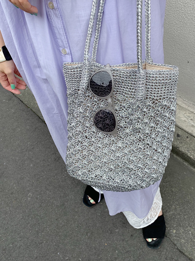 ワンピースのカラーがよく映えるよう、パンツにホワイトを選びました。小物はシルバーをチョイスし爽やかな印象に仕上げました。