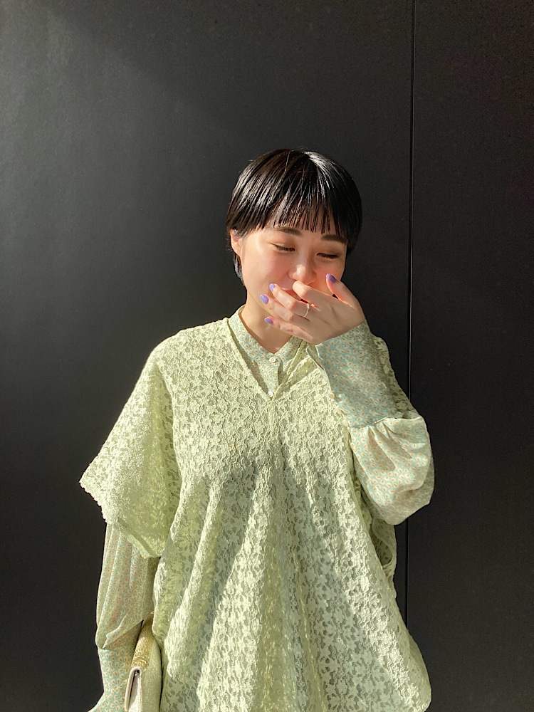 ブラウスと同カラーのレーストップスを合わせたレイヤードスタイル。