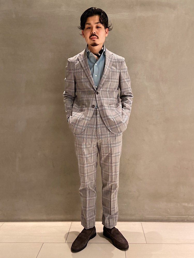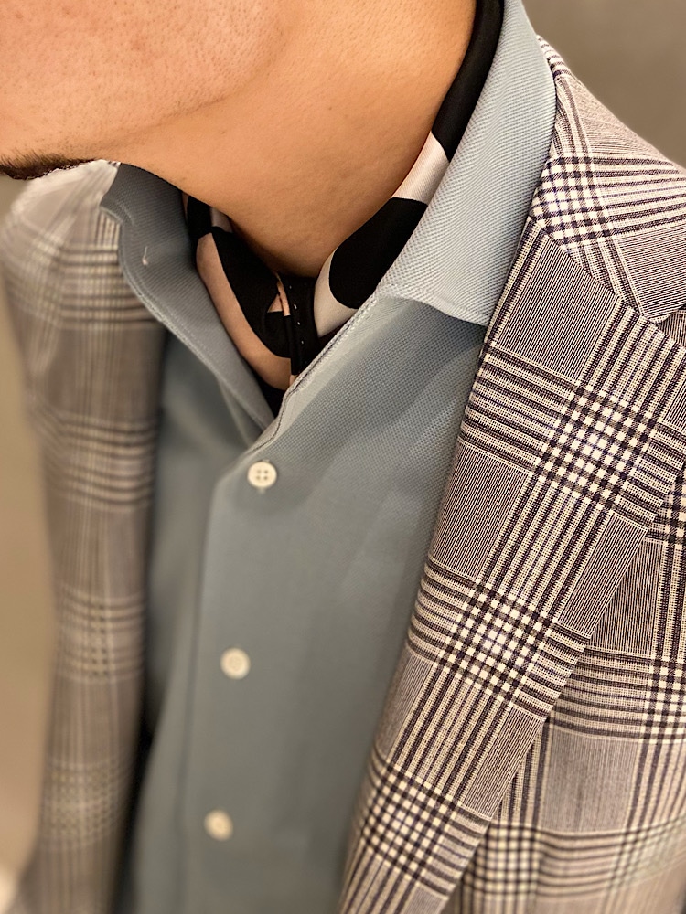 リモート対応できるセットアップでシャツも着やすいものを、襟元はスカーフで。