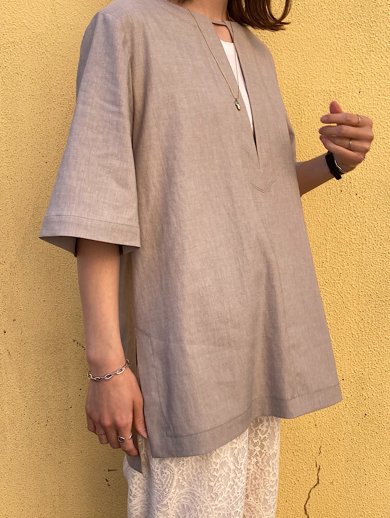 【素材感・着心地】生地はしっかりと厚みがありますが、表面にリネンの風合いが出ていて涼しく見えます。