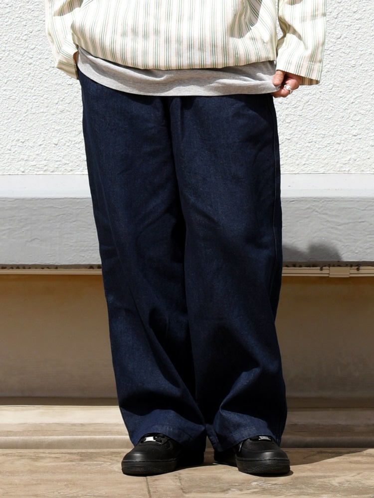 ストライプ柄がアクセントになったリネンスモックにワイドデニムを合わせたビッグシルエットコーデ