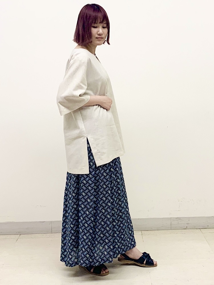 素材感・着心地:ナチュラルな夏らしい生地。肌あたり柔らかく、透け感も無い為一枚で着られる。