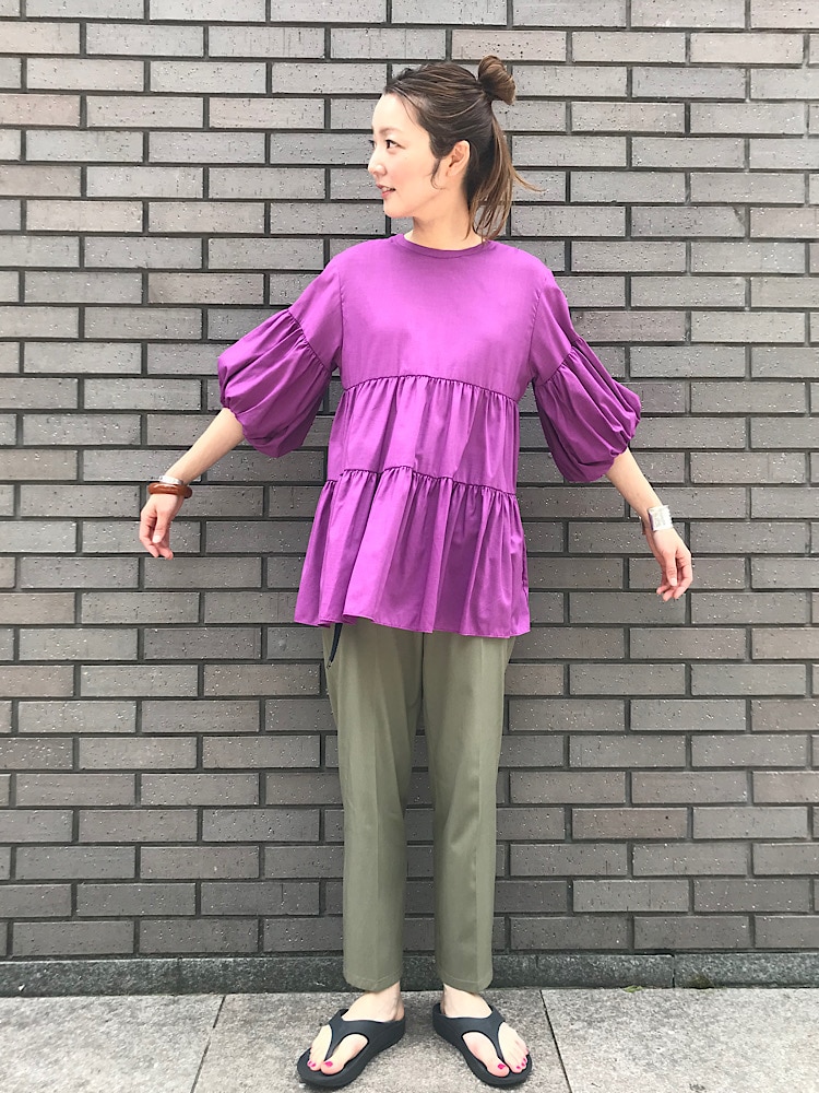 素材感・着心地:さらりとした素材感。裾にかけて広がるデザインですが、生地に落ち感がある為、スッキリとしたシルエットです